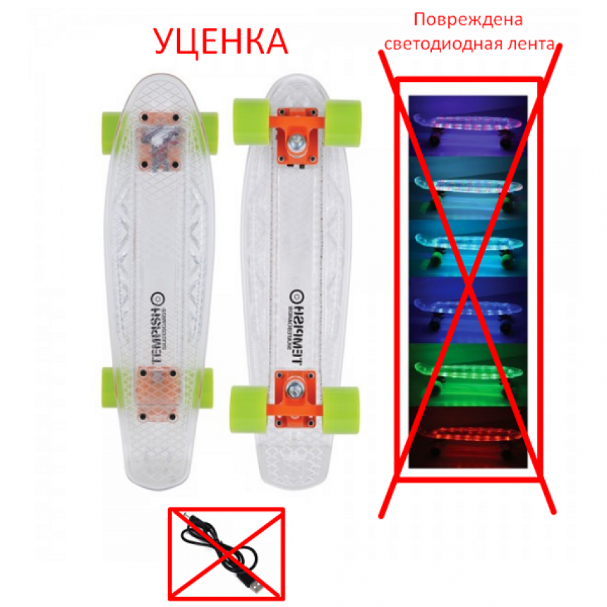 Дека выполнена из полупрозрачного полипропилена с интегрированной светодиодной лентой. Питание светодиодов осуществляется от встроенного аккумулятора, который находится на подкладке под трек, там же находится встроенное зарядное устройство и кнопка регулировки режимов работы. Дека светится по всей площади поверхности. С помощью этой системы катание и выполнение трюков в темное время суток становится более эффектным и атмосферным, а также обеспечивает дополнительную безопасность для окружающих. В комплект входит USB кабель для зарядки аккумулятора, который позволяет зарядить батарею от повербанка.